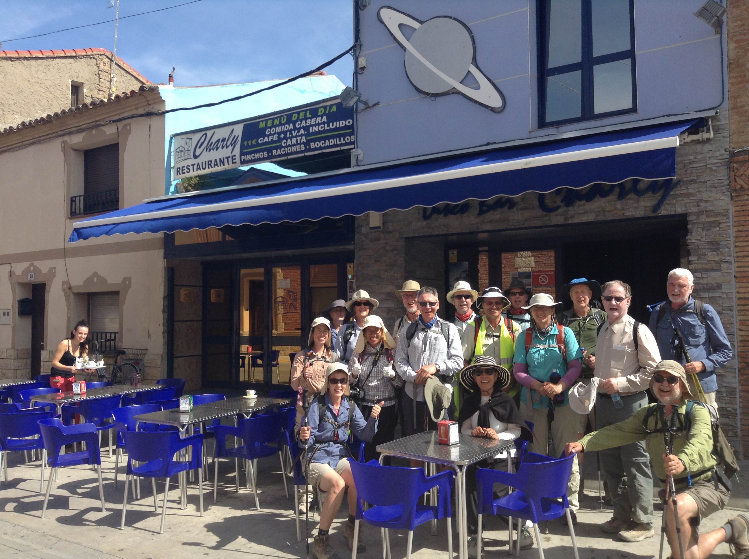 “We prayed hard last night that we would be able to complete this leg knowing it was our longest walk yet (38kms) through hot conditions with minimal shade. We were relieved to wake up this morning to cool and slightly overcast conditions. We started well with the group covering the first leg of 25 kms to Cortez by 2pm where we stopped for lunch at Charly’s Bar. As usual we proceeded to clean the bar of tapas as the hungry pilgrims restocked on carbs. For most of the day we were walking next to a large canal called the Royal Canal of Aragon, that been built high up on the side of a hill so we had panoramic views over the fertile countryside. We also had the benefit of cool wind at our backs of between 10/15 kph which kept the temperatures down. We reached Gallur at 6pm and we were thrilled to see the bus there even though it had been scheduled for 7pm. The group was on a high on the bus and very thankful having completed this challenging leg and all concluded that God had listened to our fervent prayers last night.”